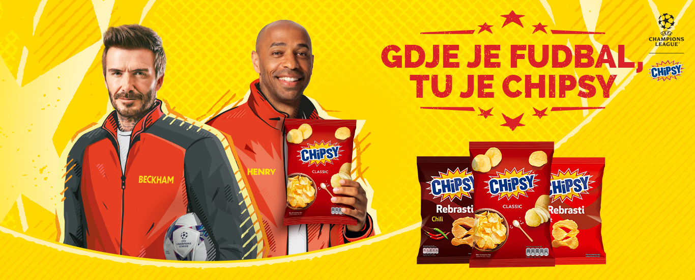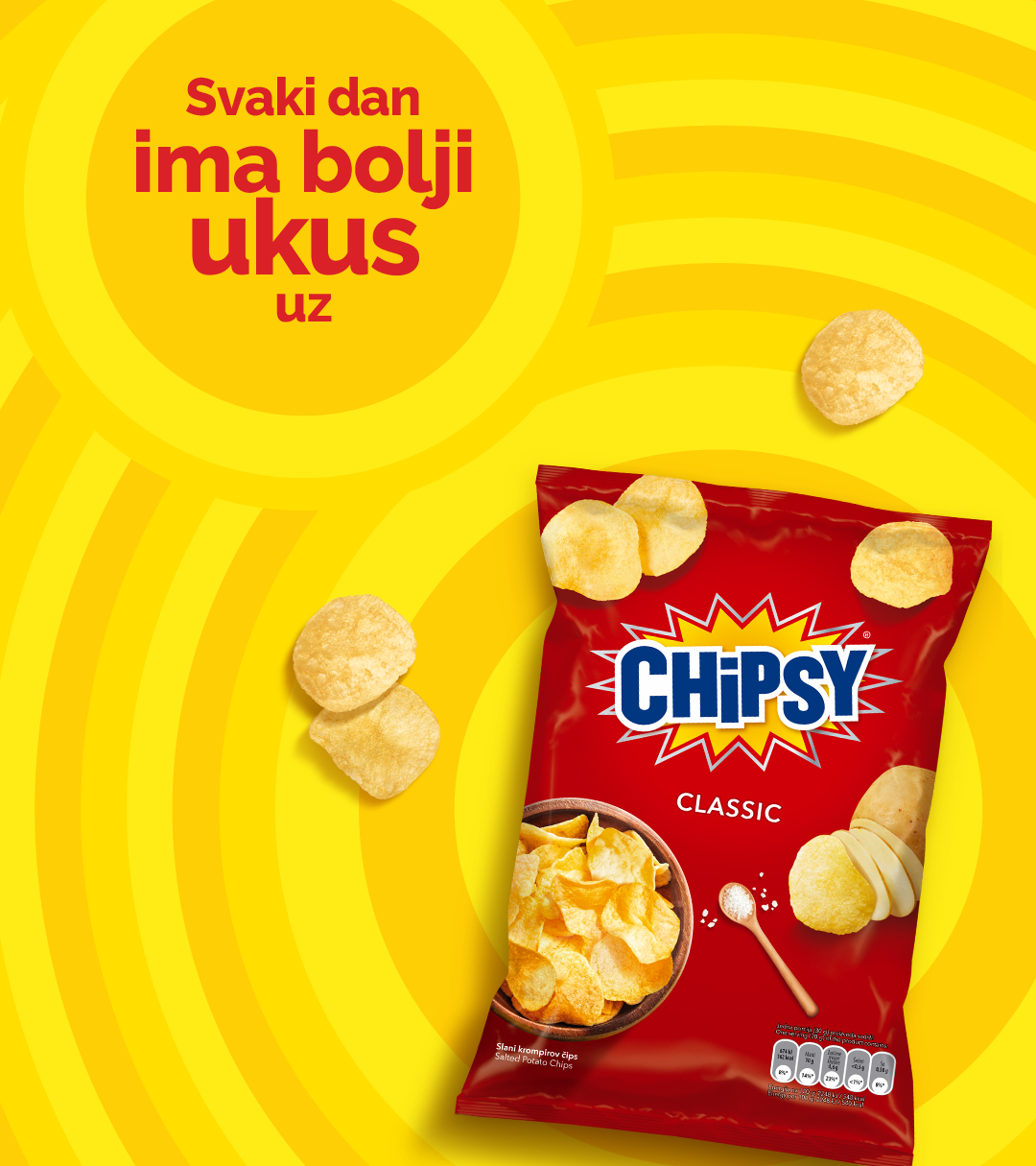 Chipsy ima misiju da uljepša svaki tvoj trenutak uživanja u filmovima, muzici, fudbalu, košarci i druženju sa prijateljima. Zahvaljujući raznovrsnoj ponudi ukusa i oblika, svako će pronaći svoj savršeni Chipsy bez obzira na to da li traži nešto klasično, možda začinjenije ili pak posno. Trudimo se da uvijek budemo tvoj saigrač: od uživanja u utakmicama Lige šampiona, pa do velikih muzičkih festivala, zato što želimo da svaki tvoj dan ima bolji ukus uz Chipsy.